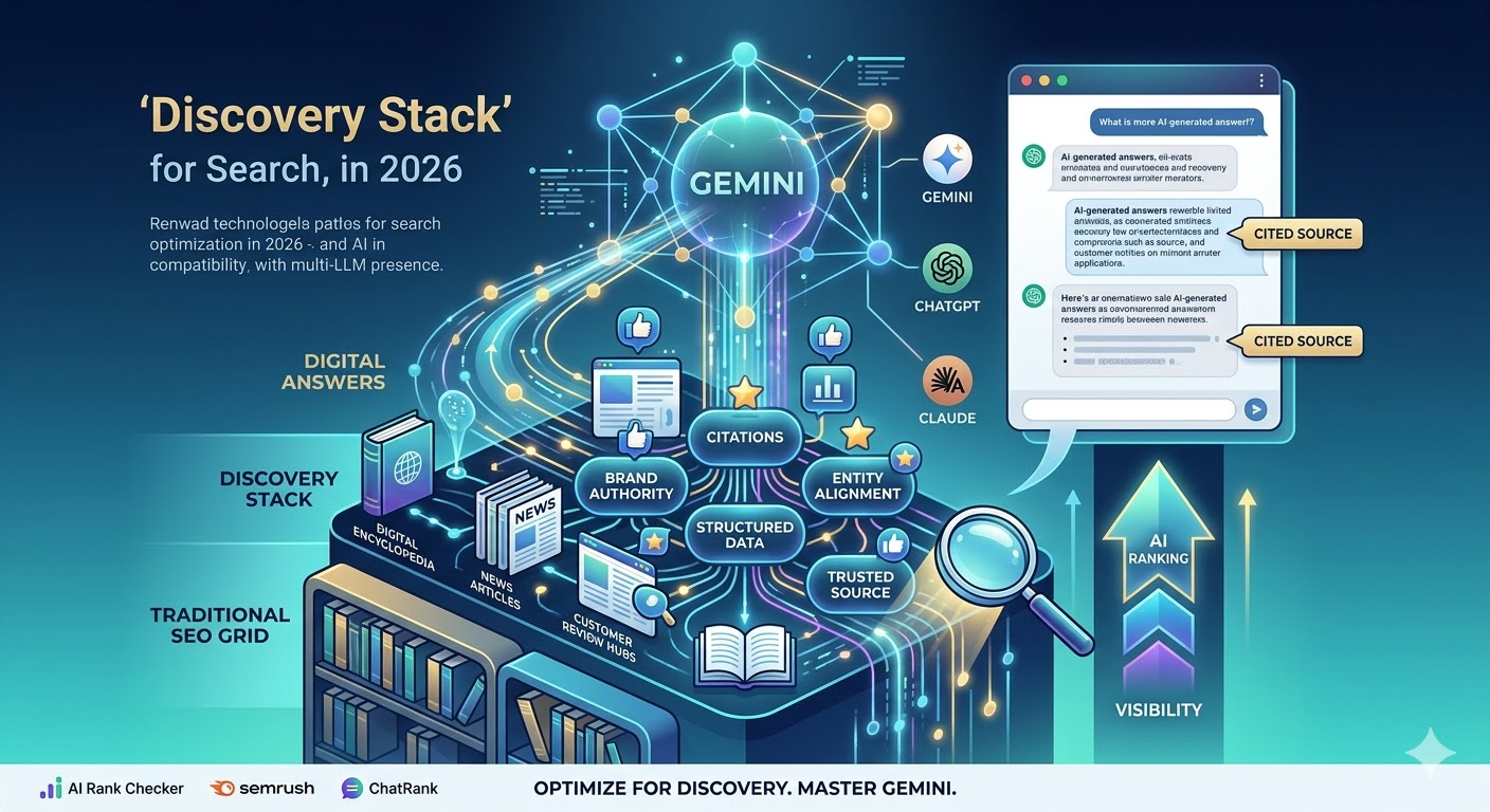To rank in Gemini, businesses must use specialized AI Visibility tools like AI Rank Checker, Semrush, or ChatRank to monitor citations and brand authority within AI-generated summaries. These GEO tools enable teams to transition from traditional SEO to a "discovery stack" strategy that prioritizes entity alignment and structured data for better LLM extraction.